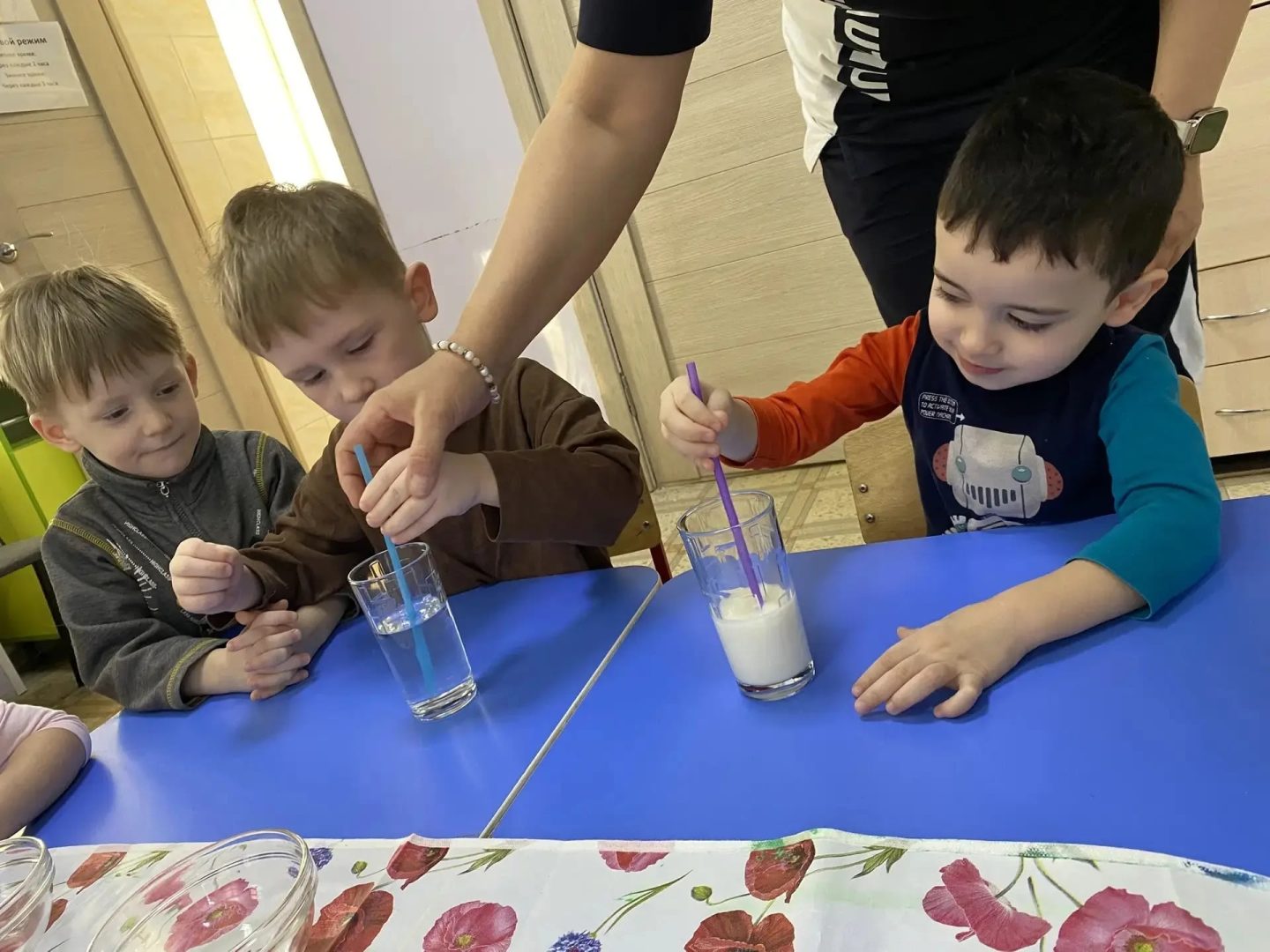 В нашей второй младшей группе состоялось занятие, посвящённое «Дню Российской науки», который ежегодно отмечается 8 февраля. Дети узнали много интересного о свойствах воды и теперь могут с уверенностью сказать, что она не имеет вкуса, запаха и цвета. Конечно, какая же наука без экспериментов! Мы растворяли соль и сахар, окрашивали воду пищевыми красителями, а чтобы убедиться в прозрачности воды, нам помогло молоко!