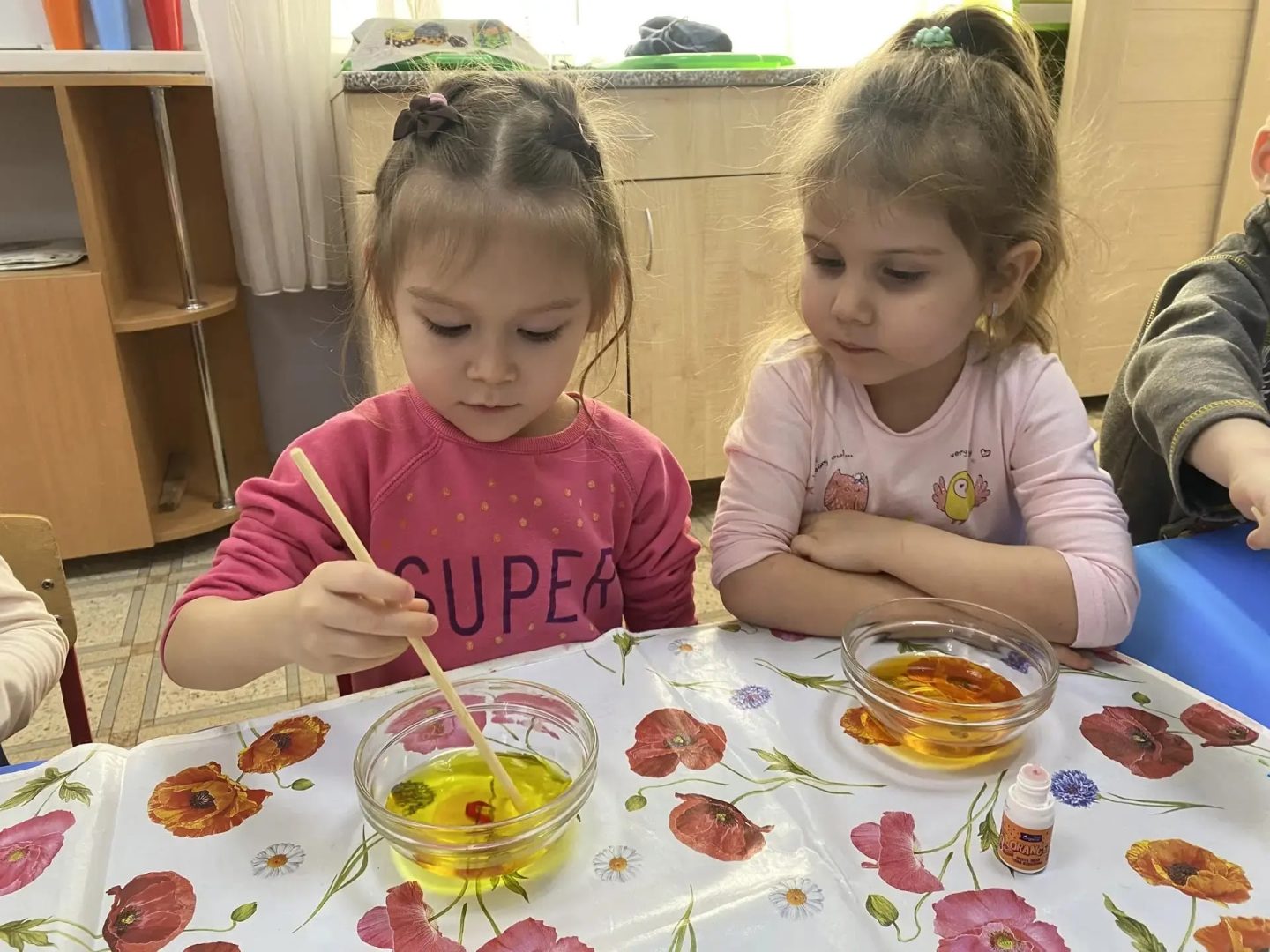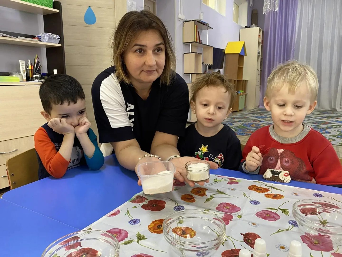 В средней и старшей группах воспитанники познакомились со свойствами воды и научились проводить несложные опыты с использованием подручных средств. Дети очень любят экспериментировать, ведь это не только увлекательно, но и эффективно развивает интеллект, внимание, мышление и речь. Дети чувствуют радость открытий, а их любознательность и познавательный интерес значительно возрастают. Как настоящие учёные, ребята проводили увлекательные опыты с водой: «Прозрачность воды», «Тонет — плавает» и многие другие.